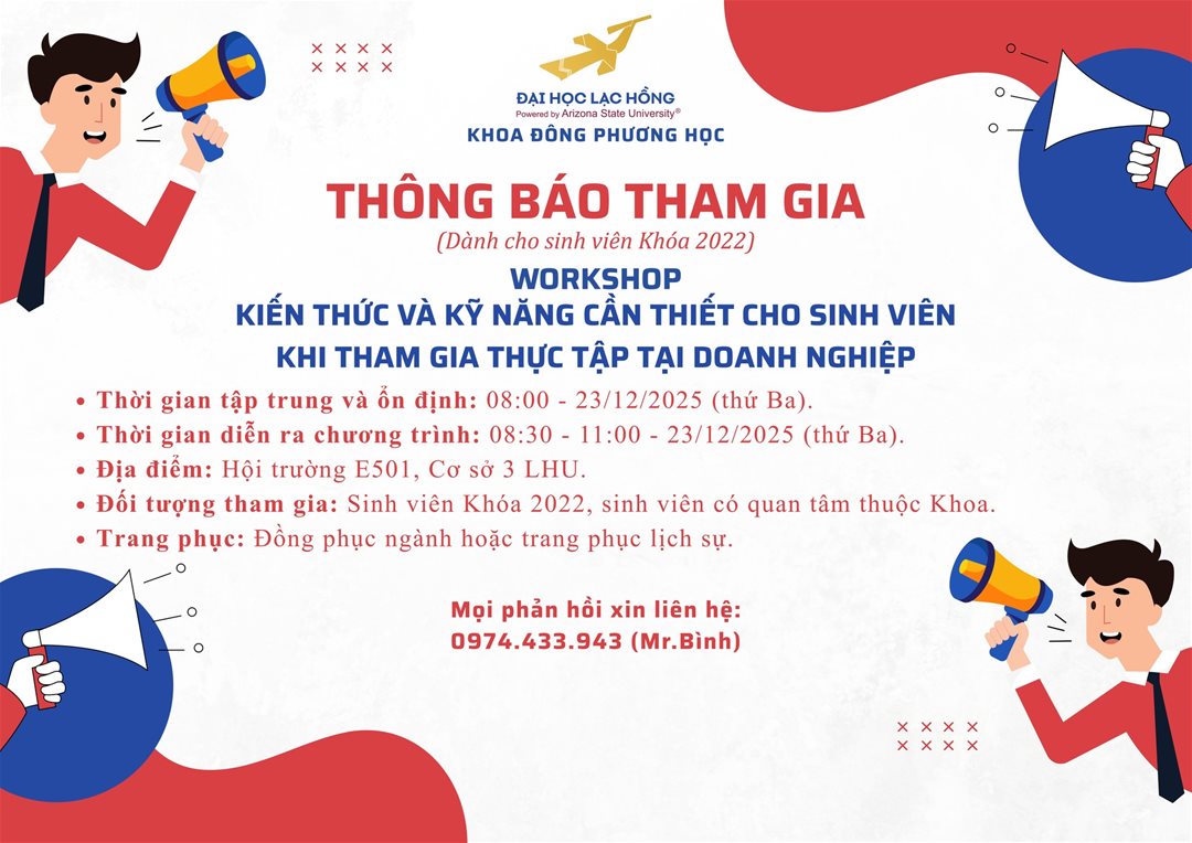Nhằm chuẩn bị thật kĩ lưỡng cho sinh viên năm cuối (khóa 2022), Khoa Đông phương học trân trọng thông báo thông tin về Workshop "Kiến thức và kỹ năng cần thiết cho sinh viên khi tham gia thực tập tại doanh nghiệp".