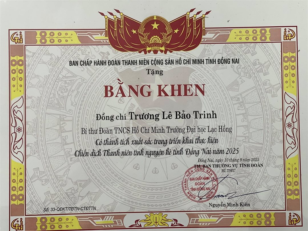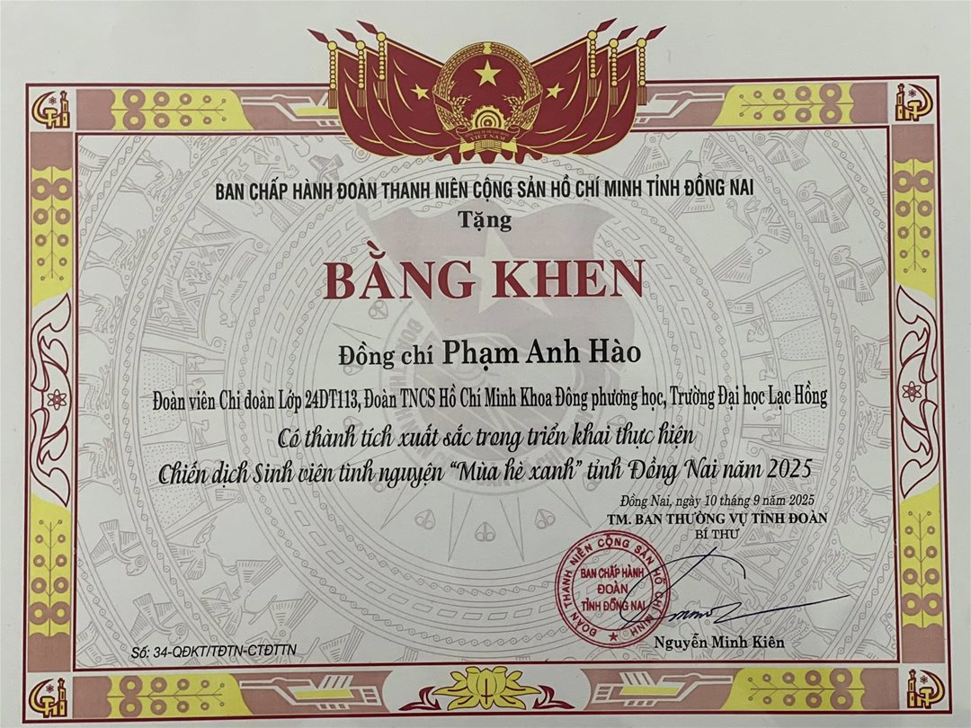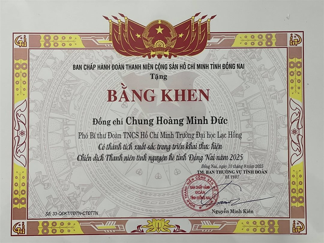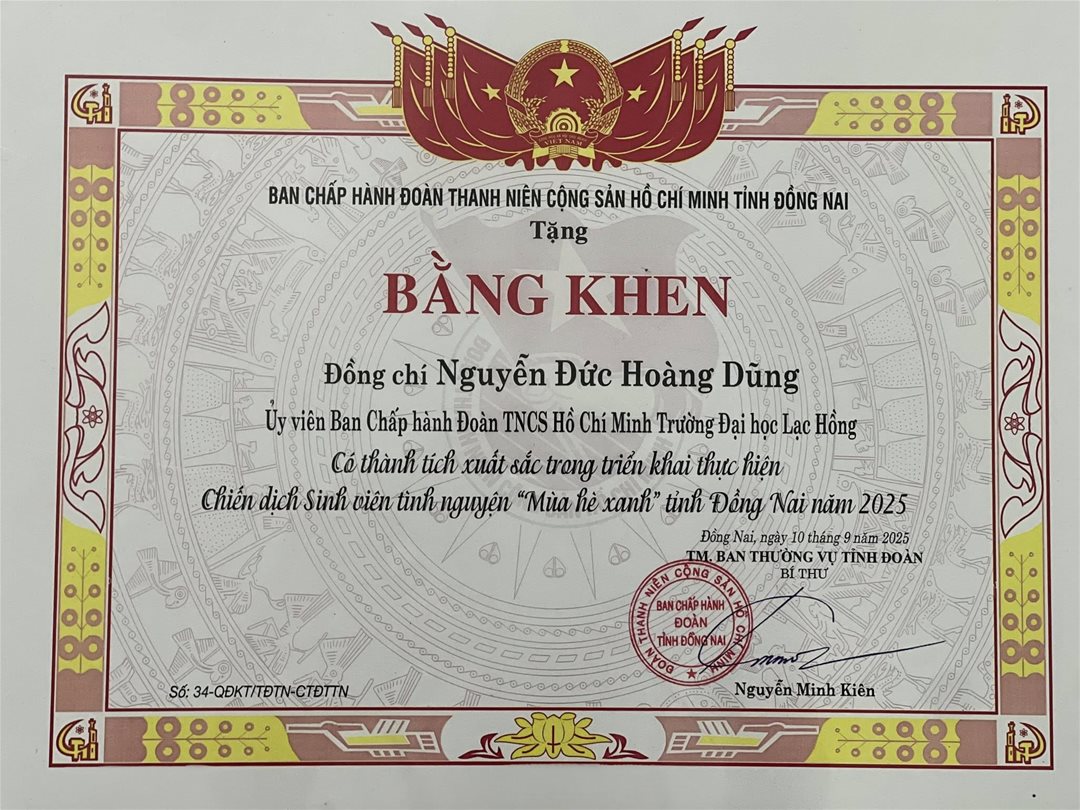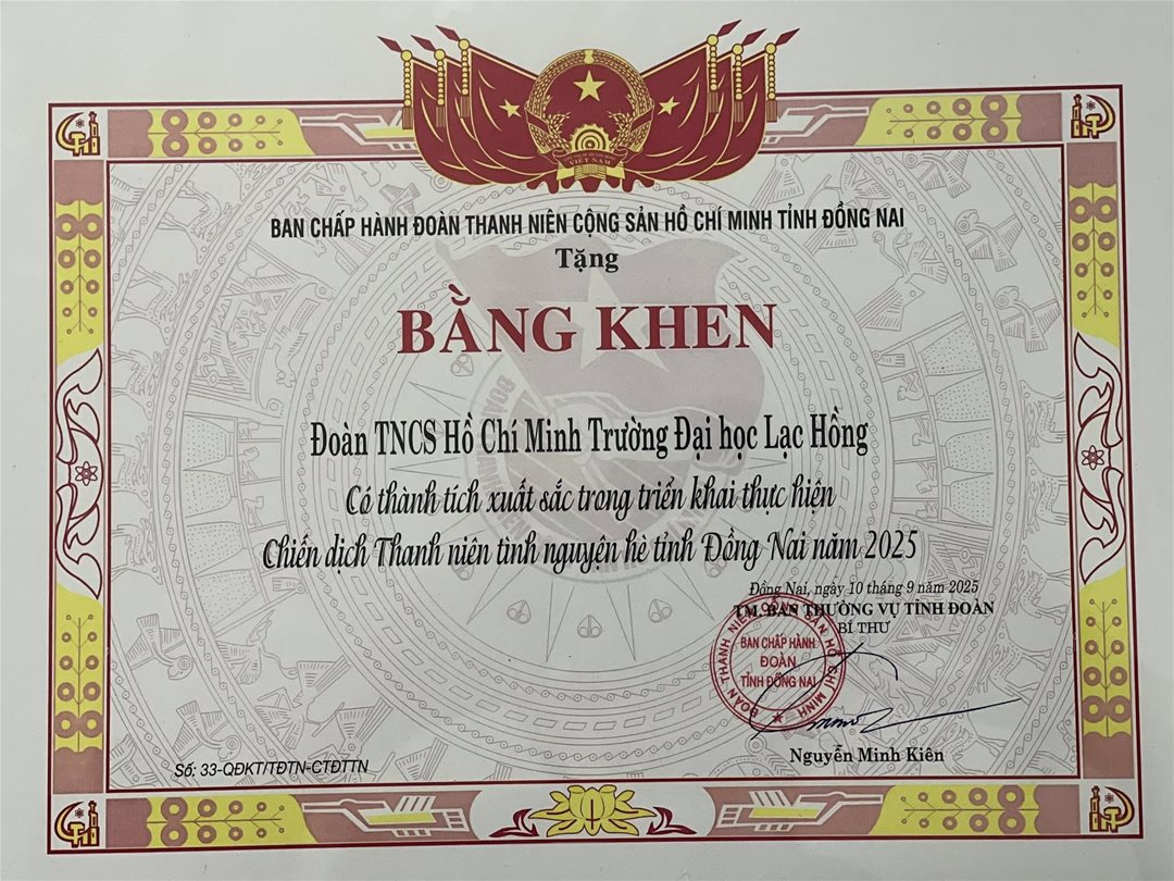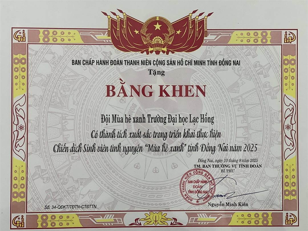 Sáng ngày 13/9/2025 tại công viên Biên Hùng, phường Trấn Biên, tỉnh Đồng Nai. Đoàn Thanh niên, Đội Mùa hè Xanh trường Đại học Lạc Hồng vinh dự nhận Bằng khen của Tỉnh đoàn đạt thành tích xuất sắc trong triển khai thực hiện Chiến dịch Thanh niên tình nguyện hè năm 2025 với các cá nhân và tập thể điền hình như sau: