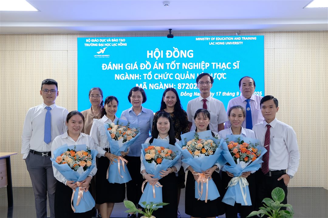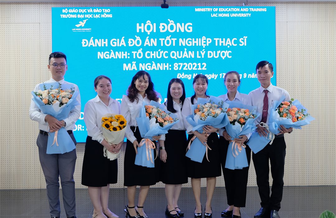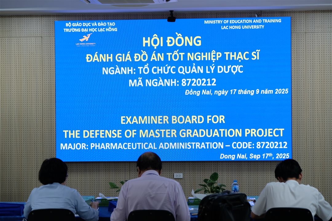 Ngày 17 tháng 9 năm 2025, tại phòng B203 cơ sở 1, của Trường Đại học Lạc Hồng (LHU), 07 học viên ngành Tổ chức quản lý dược đã hoàn thành và bảo vệ đồ án tốt nghiệp thạc sĩ của mình. Buổi bảo vệ diễn ra trong không khí trang trọng và đầy tính học thuật, đánh dấu một bước ngoặt quan trọng trong hành trình học tập và nghiên cứu của các học viên.