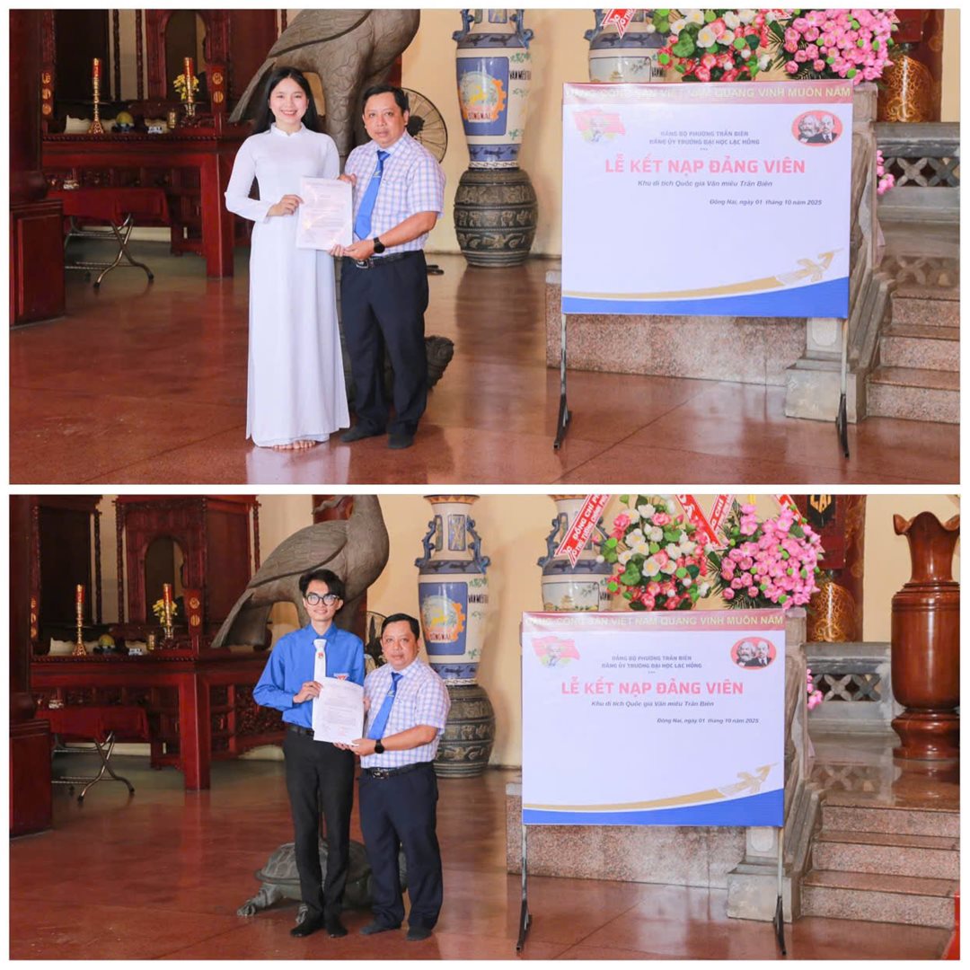 Hòa trong không khí phấn khởi chào mừng thành công của Đại hội đại biểu Đảng bộ tỉnh Đồng Nai lần thứ I, nhiệm kỳ 2025–2030, sáng ngày 01/10/2025, Đảng ủy Trường Đại học Lạc Hồng phối hợp cùng Chi bộ 4, Chi bộ 7 và Chi bộ 8 long trọng tổ chức Lễ kết nạp bốn đoàn viên sinh viên ưu tú vào Đảng Cộng sản Việt Nam tại Khu Di tích Quốc gia Văn Miếu Trấn Biên.