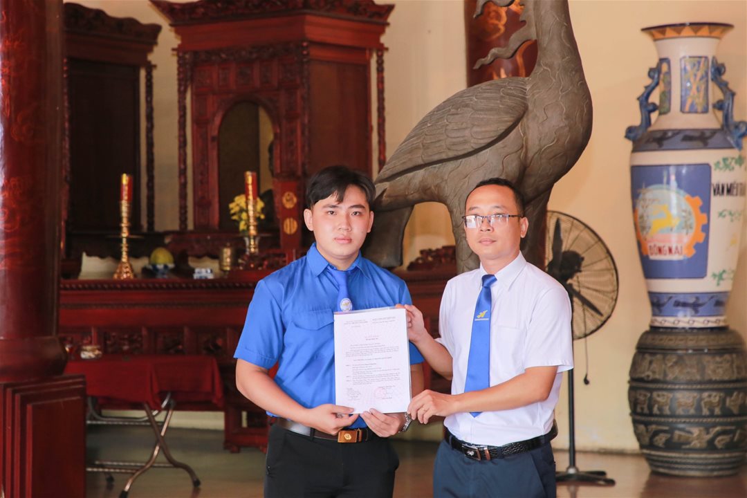 Đồng chí Nguyễn Thành Trung trao quyết định kết nạp đảng cho đoàn viên Đặng Hoàng Phúc